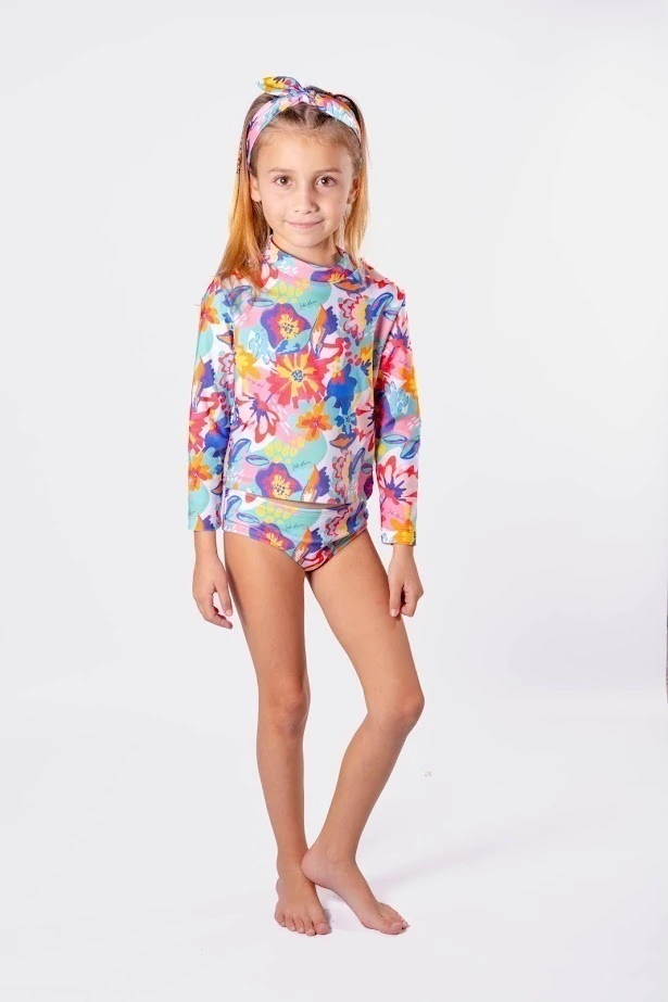 Conjunto de remera de Lycra manga larga con filtro UV 50 para proteger a nuestros niños de los rayos del sol y una bombachita estampada, forrada en su totalidad, super lindo, cómodo y muy canchero!